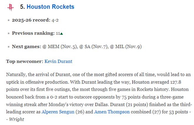 美国著名媒体ESPN公布最新一期的球队战力榜,8战全胜的卫冕冠军雷霆继续高居第一,马刺升至第二,掘金第三,湖人与火箭分列第四与第五,勇士跌至第13,杨瀚森所在的开拓者飙升至第14,7战全败的篮网依旧联盟垫底。
